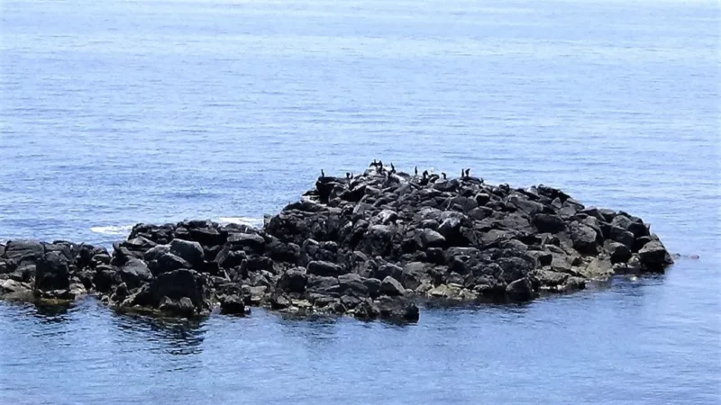展望台から下を覗くと見える尖がった岩。これが赤岩です。絶滅危惧種「ウミガラス」の生息地が、この赤岩対岸の岩場とのこと。ちょうど真下になるので展望台から直接見ることはできませんが、運が良ければ周辺を泳いでいるウミガラスを観察することができるかも知れません。